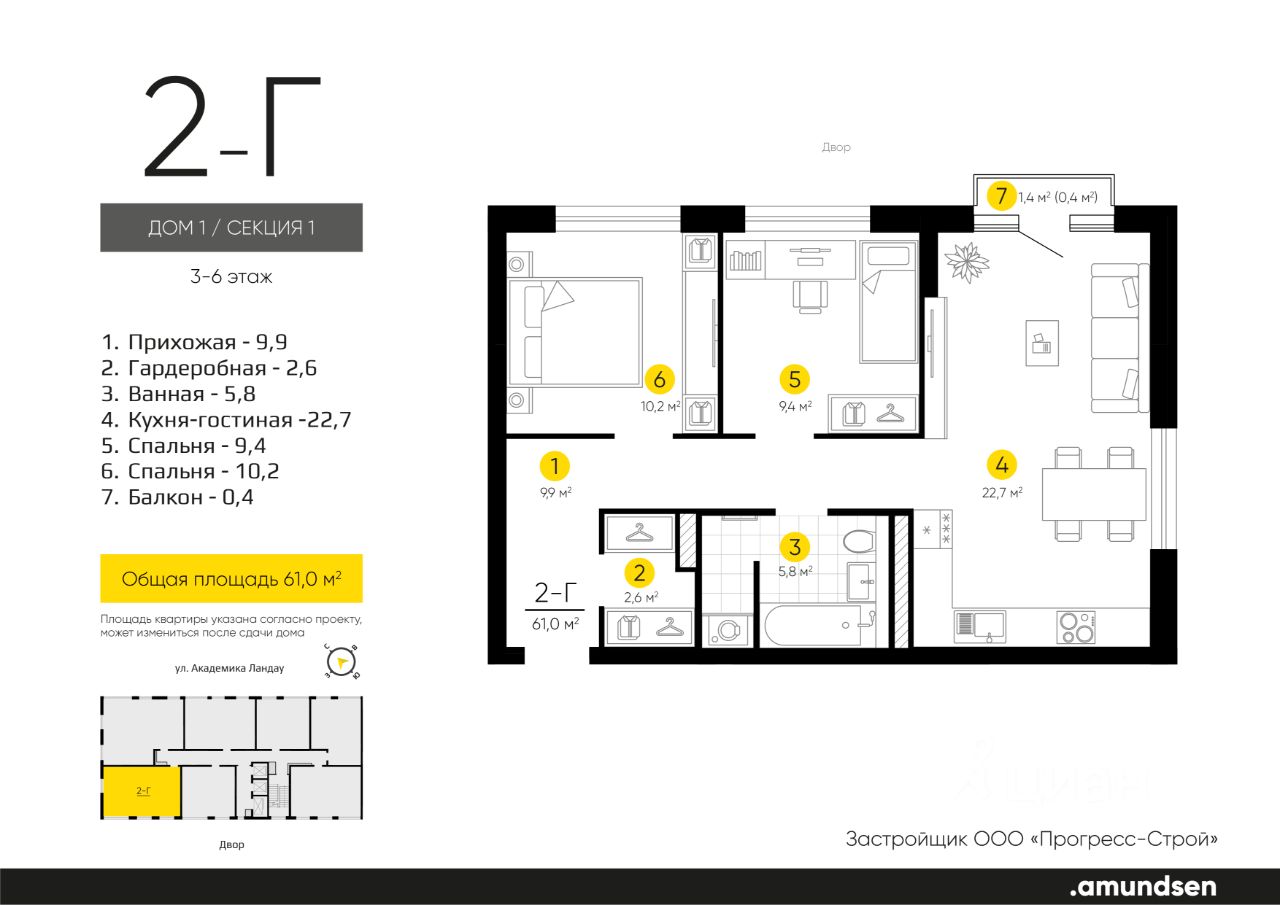 Жилой квартал "Amundsen" - для себя, для семьи, для жизни и развития. Авторская концепция проекта эффектно выделяется в 3 особенностях комплекса: фасады, двор и места общего пользования. AMUNDSEN ПРОЕКТ С ХАРАКТЕРОМ ВЕЛИКОГО ПЕРВООТКРЫВАТЕЛЯ. 4 СЕЗОНА: Двор-трансформер позволяет активно использовать все площадки круглый год. В холодное время года санки, коньки и снежные бои за главную башню. В теплое время источник наполняет двор водой и прохладой. Работают площадки для активных игр и спокойного отдыха. 6 ДЕТСКИХ ПЛОЩАДОК: Мы разделили площадки по возрастным группам для малышей и детей постарше. Качели, аттракционы, водные и активные игры созданы, чтобы познавать мир. 5 ПЛОЩАДОК ДЛЯ СПОКОЙНОГО ОТДЫХА: За счет игры с ландшафтом мы создали приватные зоны, украсили пространство разнотравьем, оживили двор источником. Шум воды, лежаки, беседки, парк места, где ты почувствуешь течение жизни. AMUNDSEN ИДЕАЛЬНОЕ МЕСТО ДЛЯ ЖИЗНИ И РАЗВИТИЯ. - Жилой квартал расположен в экологически чистом районе в окружении двух лесных массивов. - Новые современные школы и детские сады. Спортивный кластер для занятий. - Главный холл пространство для всех. Для самых маленьких игры, для взрослых кафе с ярким дизайном, тихий коворкинг, места для отдыха и светлый, просторный атриум. - Детские площадки "будущего" с оригинальным подходом к созданию игровой среды. - Безопасная территория. Круглосуточная охрана, видеонаблюдение 24/7, электронная система доступа, двор без машин. Застройщик ООО СЗ "Прогресс-Строй", проектная декларация на сайте наш.дом.рф