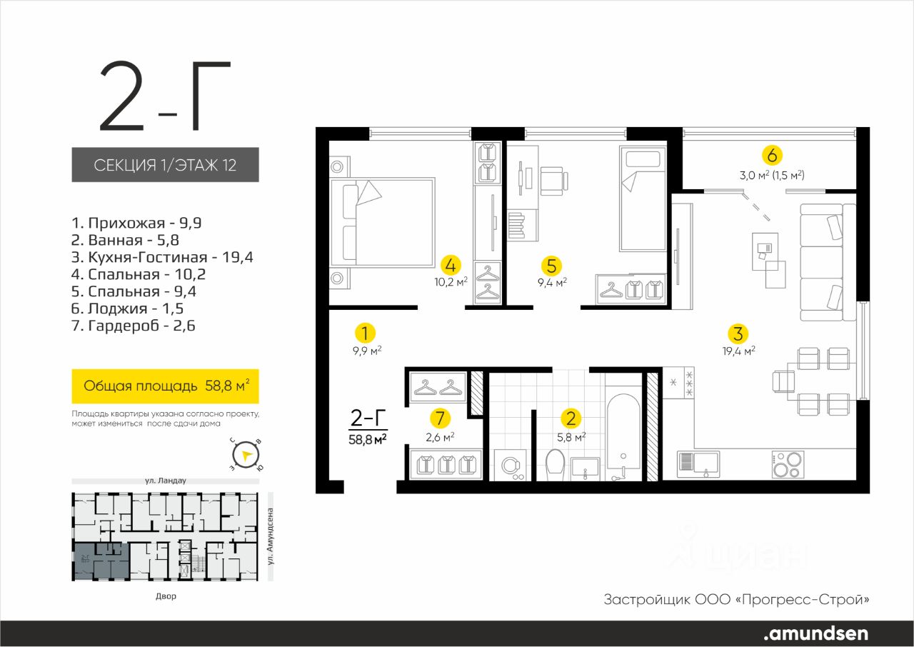 Жилой квартал "Amundsen" - для себя, для семьи, для жизни и развития. Авторская концепция проекта эффектно выделяется в 3 особенностях комплекса: фасады, двор и места общего пользования. AMUNDSEN ПРОЕКТ С ХАРАКТЕРОМ ВЕЛИКОГО ПЕРВООТКРЫВАТЕЛЯ. 4 СЕЗОНА: Двор-трансформер позволяет активно использовать все площадки круглый год. В холодное время года санки, коньки и снежные бои за главную башню. В теплое время источник наполняет двор водой и прохладой. Работают площадки для активных игр и спокойного отдыха. 6 ДЕТСКИХ ПЛОЩАДОК: Мы разделили площадки по возрастным группам для малышей и детей постарше. Качели, аттракционы, водные и активные игры созданы, чтобы познавать мир. 5 ПЛОЩАДОК ДЛЯ СПОКОЙНОГО ОТДЫХА: За счет игры с ландшафтом мы создали приватные зоны, украсили пространство разнотравьем, оживили двор источником. Шум воды, лежаки, беседки, парк места, где ты почувствуешь течение жизни. AMUNDSEN ИДЕАЛЬНОЕ МЕСТО ДЛЯ ЖИЗНИ И РАЗВИТИЯ. - Жилой квартал расположен в экологически чистом районе в окружении двух лесных массивов. - Новые современные школы и детские сады. Спортивный кластер для занятий. - Главный холл пространство для всех. Для самых маленьких игры, для взрослых кафе с ярким дизайном, тихий коворкинг, места для отдыха и светлый, просторный атриум. - Детские площадки "будущего" с оригинальным подходом к созданию игровой среды. - Безопасная территория. Круглосуточная охрана, видеонаблюдение 24/7, электронная система доступа, двор без машин. Застройщик ООО СЗ "Прогресс-Строй", проектная декларация на сайте наш.дом.рф