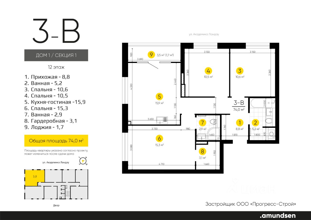 Жилой квартал "Amundsen" - для себя, для семьи, для жизни и развития. Авторская концепция проекта эффектно выделяется в 3 особенностях комплекса: фасады, двор и места общего пользования. AMUNDSEN ПРОЕКТ С ХАРАКТЕРОМ ВЕЛИКОГО ПЕРВООТКРЫВАТЕЛЯ. 4 СЕЗОНА: Двор-трансформер позволяет активно использовать все площадки круглый год. В холодное время года санки, коньки и снежные бои за главную башню. В теплое время источник наполняет двор водой и прохладой. Работают площадки для активных игр и спокойного отдыха. 6 ДЕТСКИХ ПЛОЩАДОК: Мы разделили площадки по возрастным группам для малышей и детей постарше. Качели, аттракционы, водные и активные игры созданы, чтобы познавать мир. 5 ПЛОЩАДОК ДЛЯ СПОКОЙНОГО ОТДЫХА: За счет игры с ландшафтом мы создали приватные зоны, украсили пространство разнотравьем, оживили двор источником. Шум воды, лежаки, беседки, парк места, где ты почувствуешь течение жизни. AMUNDSEN ИДЕАЛЬНОЕ МЕСТО ДЛЯ ЖИЗНИ И РАЗВИТИЯ. - Жилой квартал расположен в экологически чистом районе в окружении двух лесных массивов. - Новые современные школы и детские сады. Спортивный кластер для занятий. - Главный холл пространство для всех. Для самых маленьких игры, для взрослых кафе с ярким дизайном, тихий коворкинг, места для отдыха и светлый, просторный атриум. - Детские площадки "будущего" с оригинальным подходом к созданию игровой среды. - Безопасная территория. Круглосуточная охрана, видеонаблюдение 24/7, электронная система доступа, двор без машин. Застройщик ООО СЗ "Прогресс-Строй", проектная декларация на сайте наш.дом.рф