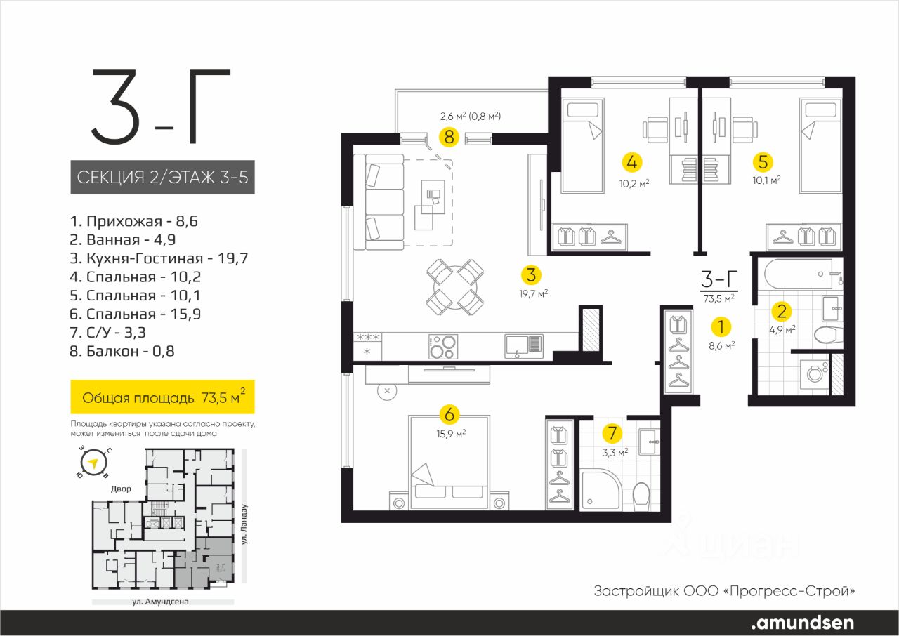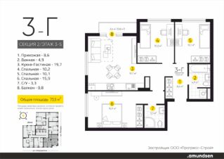 Жилой квартал "Amundsen" - для себя, для семьи, для жизни и развития. Авторская концепция проекта эффектно выделяется в 3 особенностях комплекса: фасады, двор и места общего пользования. AMUNDSEN ПРОЕКТ С ХАРАКТЕРОМ ВЕЛИКОГО ПЕРВООТКРЫВАТЕЛЯ. 4 СЕЗОНА: Двор-трансформер позволяет активно использовать все площадки круглый год. В холодное время года санки, коньки и снежные бои за главную башню. В теплое время источник наполняет двор водой и прохладой. Работают площадки для активных игр и спокойного отдыха. 6 ДЕТСКИХ ПЛОЩАДОК: Мы разделили площадки по возрастным группам для малышей и детей постарше. Качели, аттракционы, водные и активные игры созданы, чтобы познавать мир. 5 ПЛОЩАДОК ДЛЯ СПОКОЙНОГО ОТДЫХА: За счет игры с ландшафтом мы создали приватные зоны, украсили пространство разнотравьем, оживили двор источником. Шум воды, лежаки, беседки, парк места, где ты почувствуешь течение жизни. AMUNDSEN ИДЕАЛЬНОЕ МЕСТО ДЛЯ ЖИЗНИ И РАЗВИТИЯ. - Жилой квартал расположен в экологически чистом районе в окружении двух лесных массивов. - Новые современные школы и детские сады. Спортивный кластер для занятий. - Главный холл пространство для всех. Для самых маленьких игры, для взрослых кафе с ярким дизайном, тихий коворкинг, места для отдыха и светлый, просторный атриум. - Детские площадки "будущего" с оригинальным подходом к созданию игровой среды. - Безопасная территория. Круглосуточная охрана, видеонаблюдение 24/7, электронная система доступа, двор без машин. Застройщик ООО СЗ "Прогресс-Строй", проектная декларация на сайте наш.дом.рф