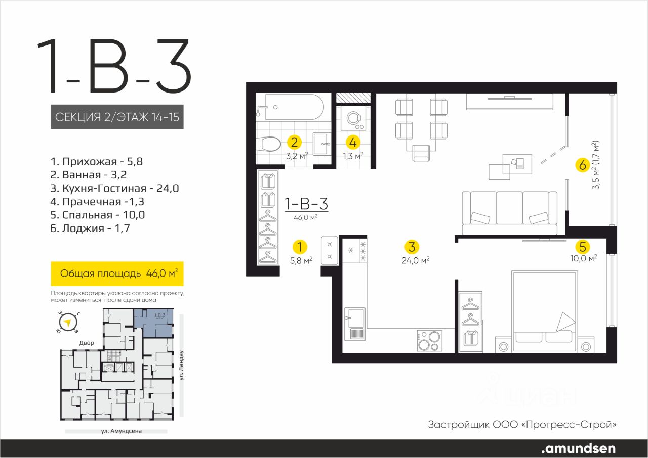Жилой квартал "Amundsen" - для себя, для семьи, для жизни и развития. Авторская концепция проекта эффектно выделяется в 3 особенностях комплекса: фасады, двор и места общего пользования. AMUNDSEN ПРОЕКТ С ХАРАКТЕРОМ ВЕЛИКОГО ПЕРВООТКРЫВАТЕЛЯ. 4 СЕЗОНА: Двор-трансформер позволяет активно использовать все площадки круглый год. В холодное время года санки, коньки и снежные бои за главную башню. В теплое время источник наполняет двор водой и прохладой. Работают площадки для активных игр и спокойного отдыха. 6 ДЕТСКИХ ПЛОЩАДОК: Мы разделили площадки по возрастным группам для малышей и детей постарше. Качели, аттракционы, водные и активные игры созданы, чтобы познавать мир. 5 ПЛОЩАДОК ДЛЯ СПОКОЙНОГО ОТДЫХА: За счет игры с ландшафтом мы создали приватные зоны, украсили пространство разнотравьем, оживили двор источником. Шум воды, лежаки, беседки, парк места, где ты почувствуешь течение жизни. AMUNDSEN ИДЕАЛЬНОЕ МЕСТО ДЛЯ ЖИЗНИ И РАЗВИТИЯ. - Жилой квартал расположен в экологически чистом районе в окружении двух лесных массивов. - Новые современные школы и детские сады. Спортивный кластер для занятий. - Главный холл пространство для всех. Для самых маленьких игры, для взрослых кафе с ярким дизайном, тихий коворкинг, места для отдыха и светлый, просторный атриум. - Детские площадки "будущего" с оригинальным подходом к созданию игровой среды. - Безопасная территория. Круглосуточная охрана, видеонаблюдение 24/7, электронная система доступа, двор без машин. Застройщик ООО СЗ "Прогресс-Строй", проектная декларация на сайте наш.дом.рф