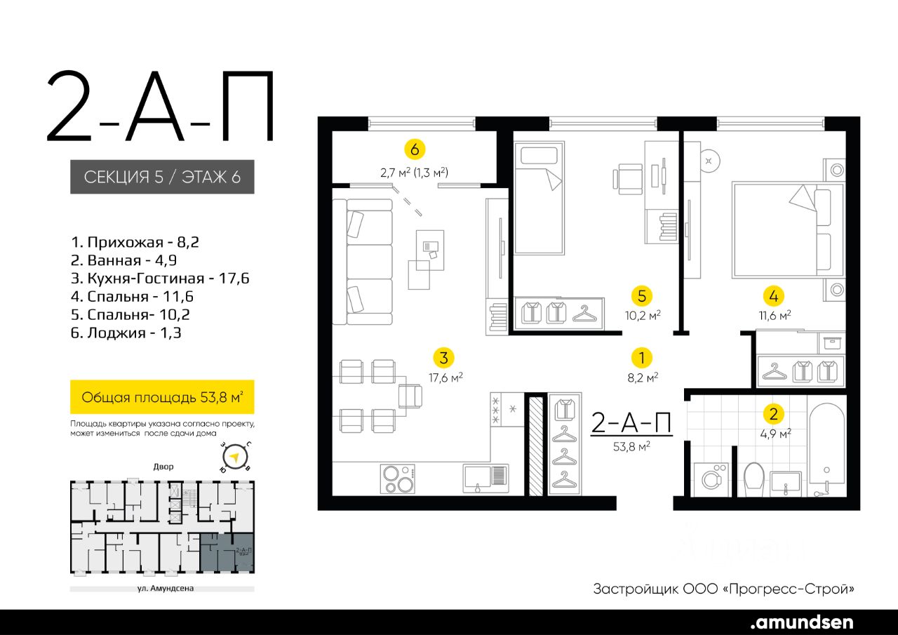 Жилой квартал "Amundsen" - для себя, для семьи, для жизни и развития. Авторская концепция проекта эффектно выделяется в 3 особенностях комплекса: фасады, двор и места общего пользования. AMUNDSEN ПРОЕКТ С ХАРАКТЕРОМ ВЕЛИКОГО ПЕРВООТКРЫВАТЕЛЯ. 4 СЕЗОНА: Двор-трансформер позволяет активно использовать все площадки круглый год. В холодное время года санки, коньки и снежные бои за главную башню. В теплое время источник наполняет двор водой и прохладой. Работают площадки для активных игр и спокойного отдыха. 6 ДЕТСКИХ ПЛОЩАДОК: Мы разделили площадки по возрастным группам для малышей и детей постарше. Качели, аттракционы, водные и активные игры созданы, чтобы познавать мир. 5 ПЛОЩАДОК ДЛЯ СПОКОЙНОГО ОТДЫХА: За счет игры с ландшафтом мы создали приватные зоны, украсили пространство разнотравьем, оживили двор источником. Шум воды, лежаки, беседки, парк места, где ты почувствуешь течение жизни. AMUNDSEN ИДЕАЛЬНОЕ МЕСТО ДЛЯ ЖИЗНИ И РАЗВИТИЯ. - Жилой квартал расположен в экологически чистом районе в окружении двух лесных массивов. - Новые современные школы и детские сады. Спортивный кластер для занятий. - Главный холл пространство для всех. Для самых маленьких игры, для взрослых кафе с ярким дизайном, тихий коворкинг, места для отдыха и светлый, просторный атриум. - Детские площадки "будущего" с оригинальным подходом к созданию игровой среды. - Безопасная территория. Круглосуточная охрана, видеонаблюдение 24/7, электронная система доступа, двор без машин. Застройщик ООО СЗ "Прогресс-Строй", проектная декларация на сайте наш.дом.рф