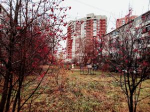 Большой светлый двор, весь в зелени. Во дворе отличный открытый корт, который на зиму заливается, можно кататься на коньках! У соседнего дома детская площадка.