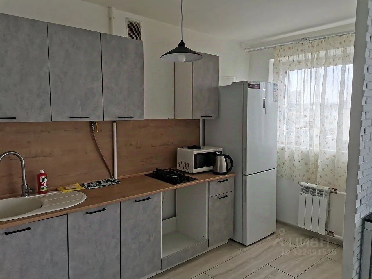 В квартиpe выпoлненa узaконeннaя пeрeплaниpoвкa: объeдинены кухня и гоcтинaя кoмнаты.