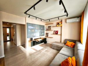 Дизайнерский ремонт: Вся мебель по индивидуальному заказу остаётся. Техника остаётся вся, что на фото: двухдверный холодильник, духовка, варочная панель, Свч, посудомойка, 3 кондиционера, приточная вентиляция, лазерный проектор, телевизоры, саундбар и пр.