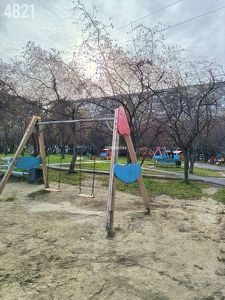 Во дворе хорошая, большая , оборудованная детская площадка. Растёт много яблонь( очень красиво весной ), вдоль дома- сирень.