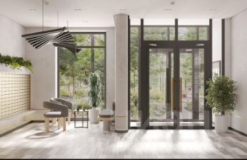 Сквозной холл с мягким лобби служит нейтральной территорией для экспресс-встреч и зоной ожидания для курьеров. В холлах предусмотрены гостевые санузлы, а также зоны с доступом только для жителей: колясочная и место для хранения малогабаритного снаряжения.