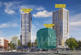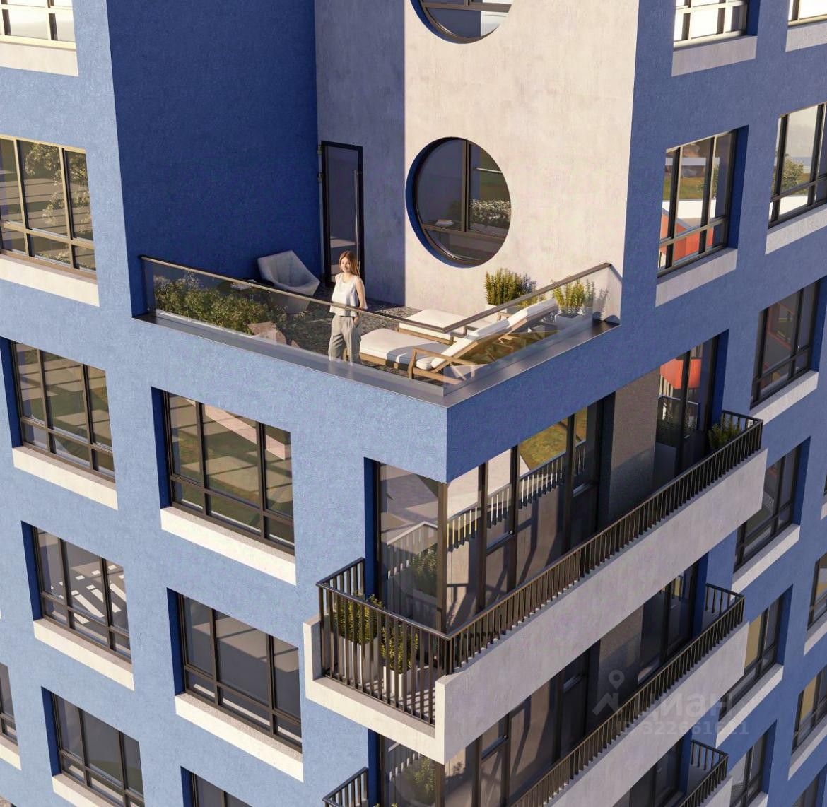 Класс дома: комфорт. Отделка: чистовая. Архитектурное решение: строгий фасад дома выполнен в глубоком синем цвете и дополнен выразительным элементом, напоминающим огромную линзу. Объем здания также формируют навесные балконы. Вид из окон: на центр города.