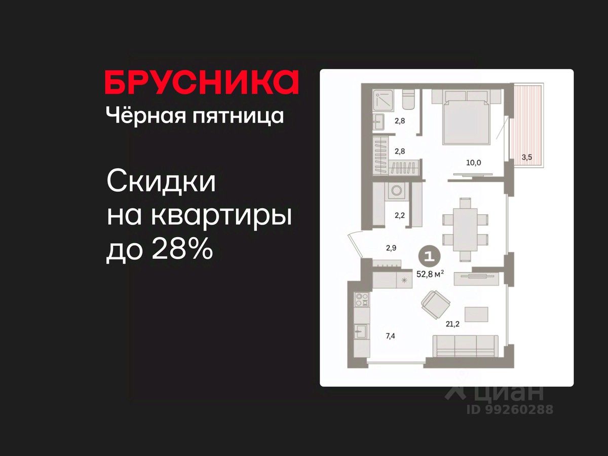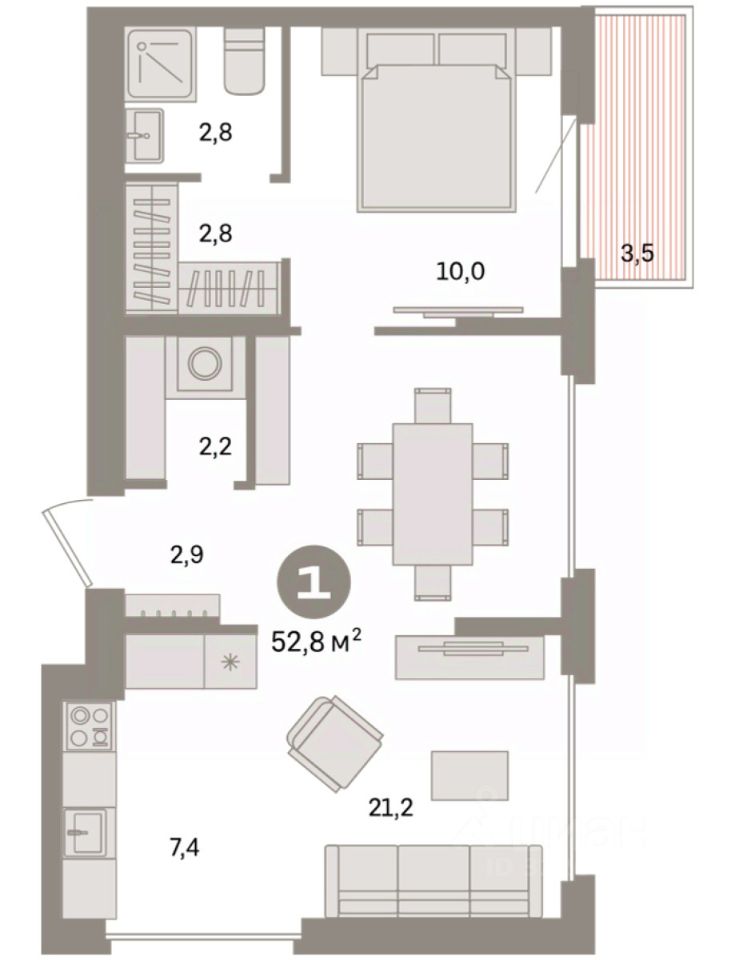 Квартира с кухней-гостиной и одной спальней в квартале "Депо". Особенности планировки: гардеробная, предчистовая отделка, мастер-спальня, балкон.