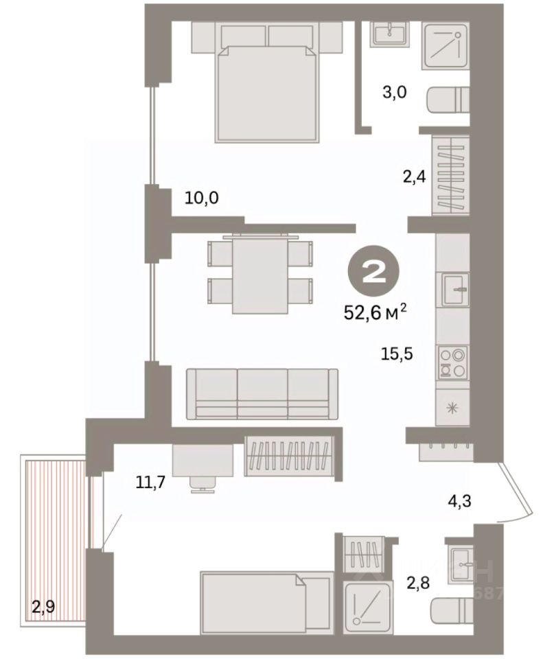Квартира с кухней-гостиной и двумя спальнями в квартале "Депо". Особенности планировки: гардеробная, разнесённые спальни, предчистовая отделка, мастер-спальня, балкон.