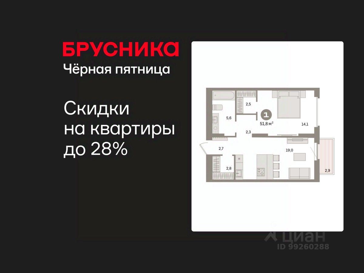 Квартира с кухней-гостиной и одной спальней в квартале "Депо". Особенности планировки: гардеробная, вид во двор, предчистовая отделка, балкон.
