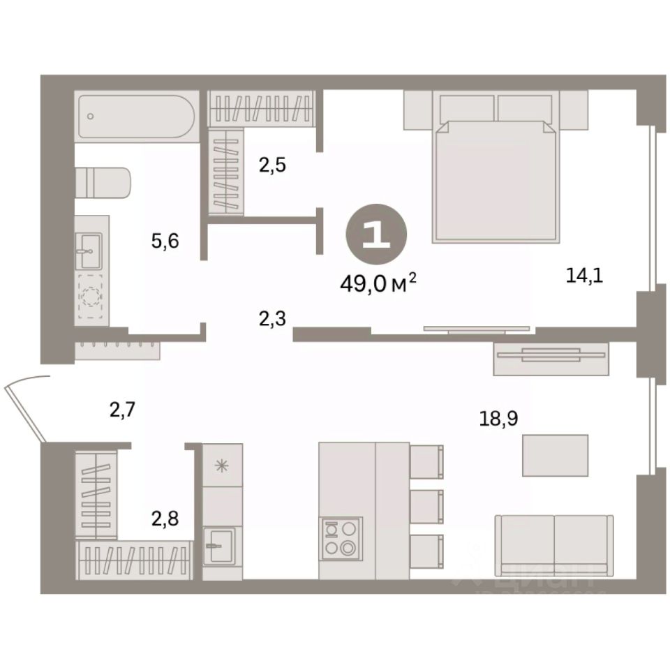 Квартира с кухней-гостиной и одной спальней в квартале "Депо". Особенности планировки: гардеробная, вид во двор, предчистовая отделка.