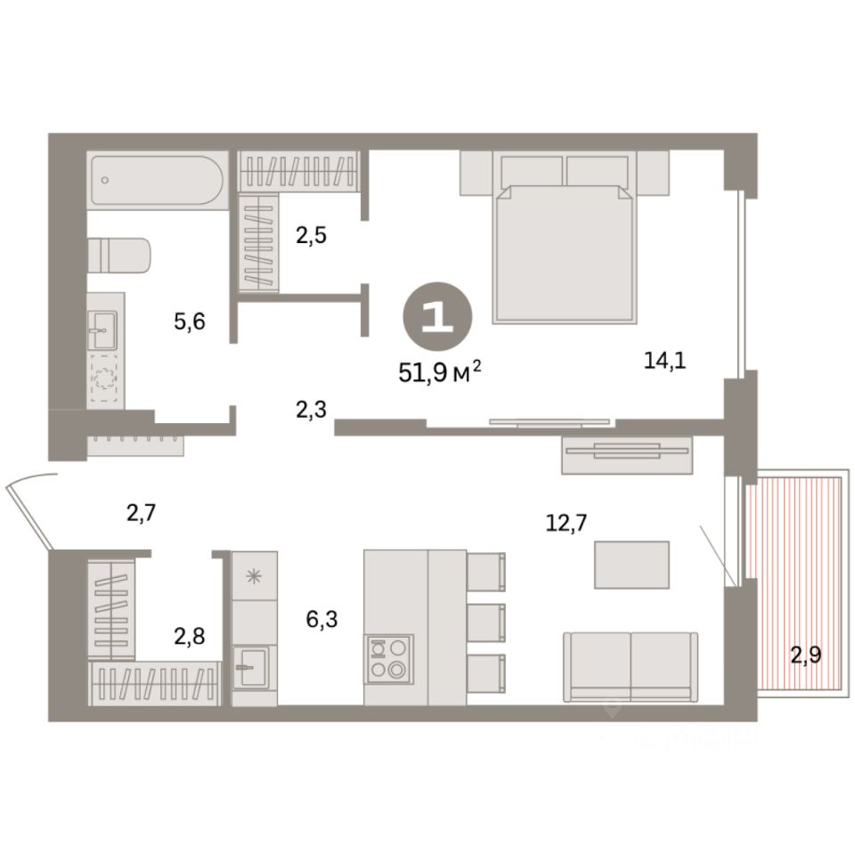 Квартира с кухней-гостиной и одной спальней в квартале "Депо". Особенности планировки: гардеробная, вид во двор, предчистовая отделка, балкон.