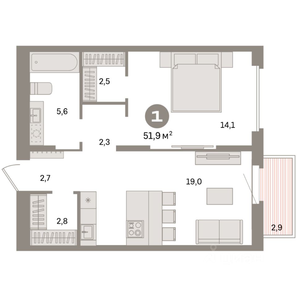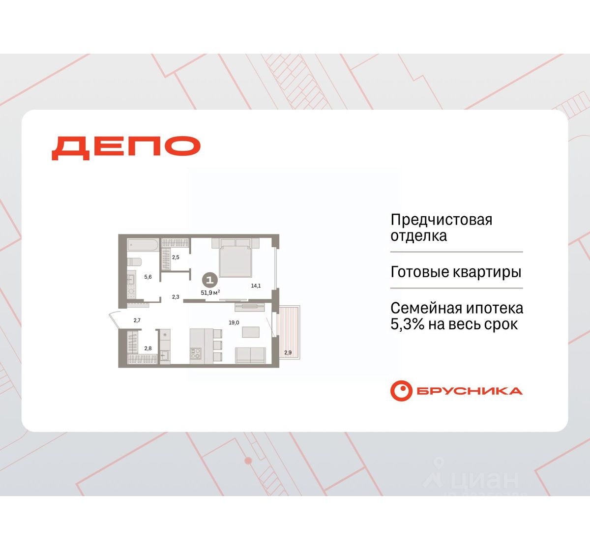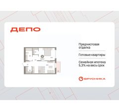 Квартира с кухней-гостиной и одной спальней в квартале "Депо". Особенности планировки: гардеробная, вид во двор, предчистовая отделка, балкон.
