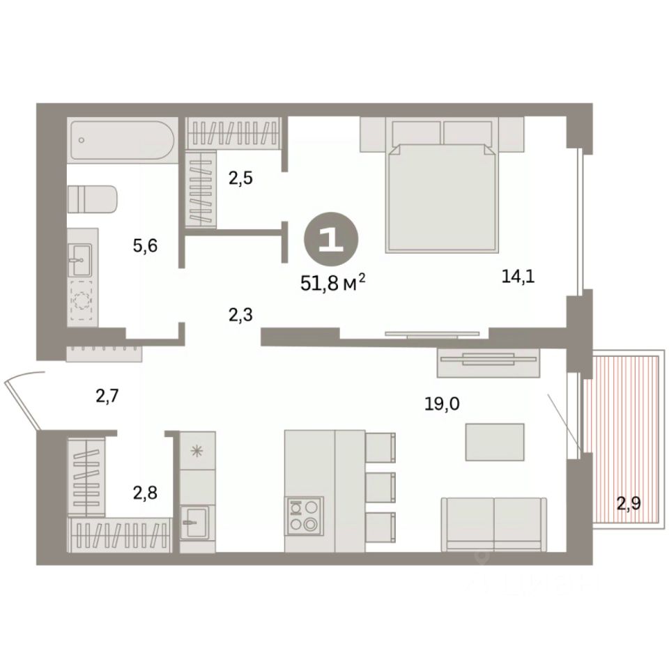 Квартира с кухней-гостиной и одной спальней в квартале "Депо". Особенности планировки: гардеробная, вид во двор, предчистовая отделка, балкон.