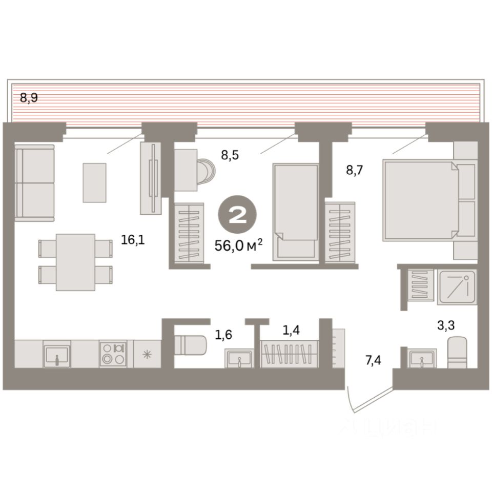 Квартира с кухней-гостиной и двумя спальнями в квартале "Депо". Особенности планировки: второй санузел, гардеробная, предчистовая отделка, терраса на крыше.