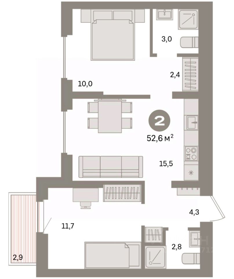 Квартира с кухней-гостиной и двумя спальнями в квартале "Депо". Особенности планировки: гардеробная, разнесённые спальни, предчистовая отделка, мастер-спальня, балкон.