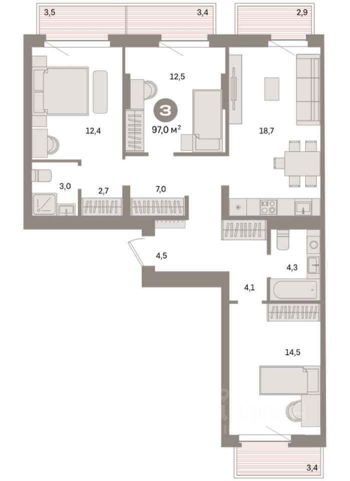 Квартира с кухней-гостиной и тремя спальнями в квартале "Депо". Особенности планировки: окна на две стороны, гардеробная, вид во двор, разнесённые спальни, предчистовая отделка, мастер-спальня, балкон.