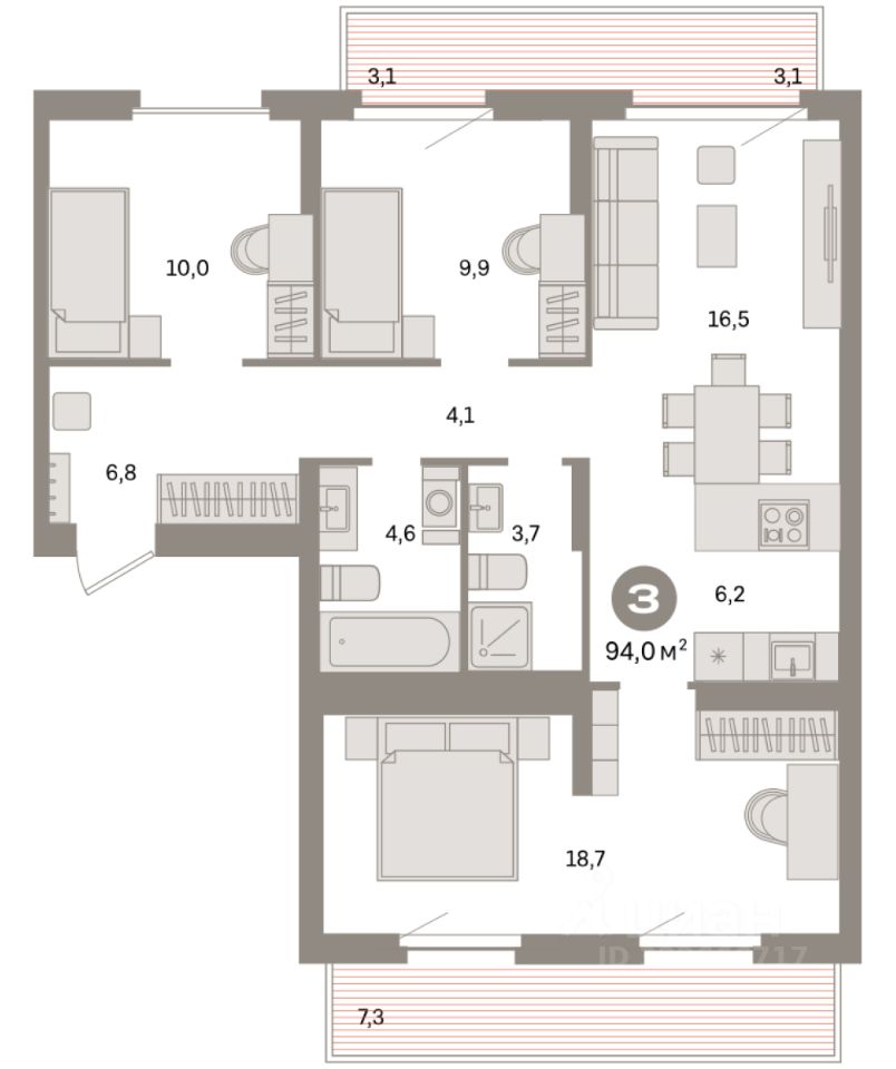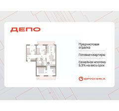 Квартира с кухней-гостиной и тремя спальнями в квартале "Депо". Особенности планировки: окна на две стороны, второй санузел, вид во двор, разнесённые спальни, предчистовая отделка, балкон, терраса на крыше.