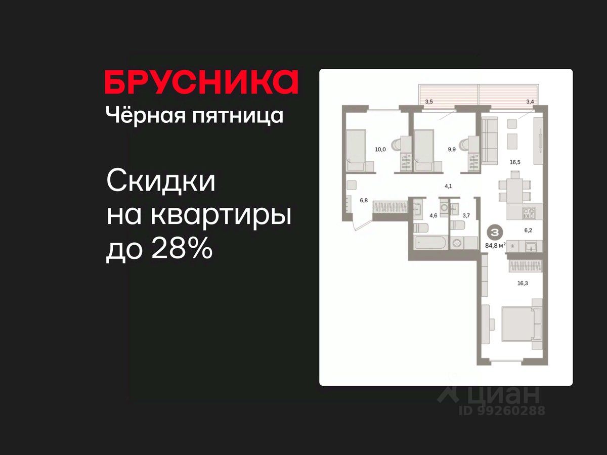 Квартира с кухней-гостиной и тремя спальнями в квартале "Депо". Особенности планировки: окна на две стороны, второй санузел, вид во двор, разнесённые спальни, предчистовая отделка, балкон.