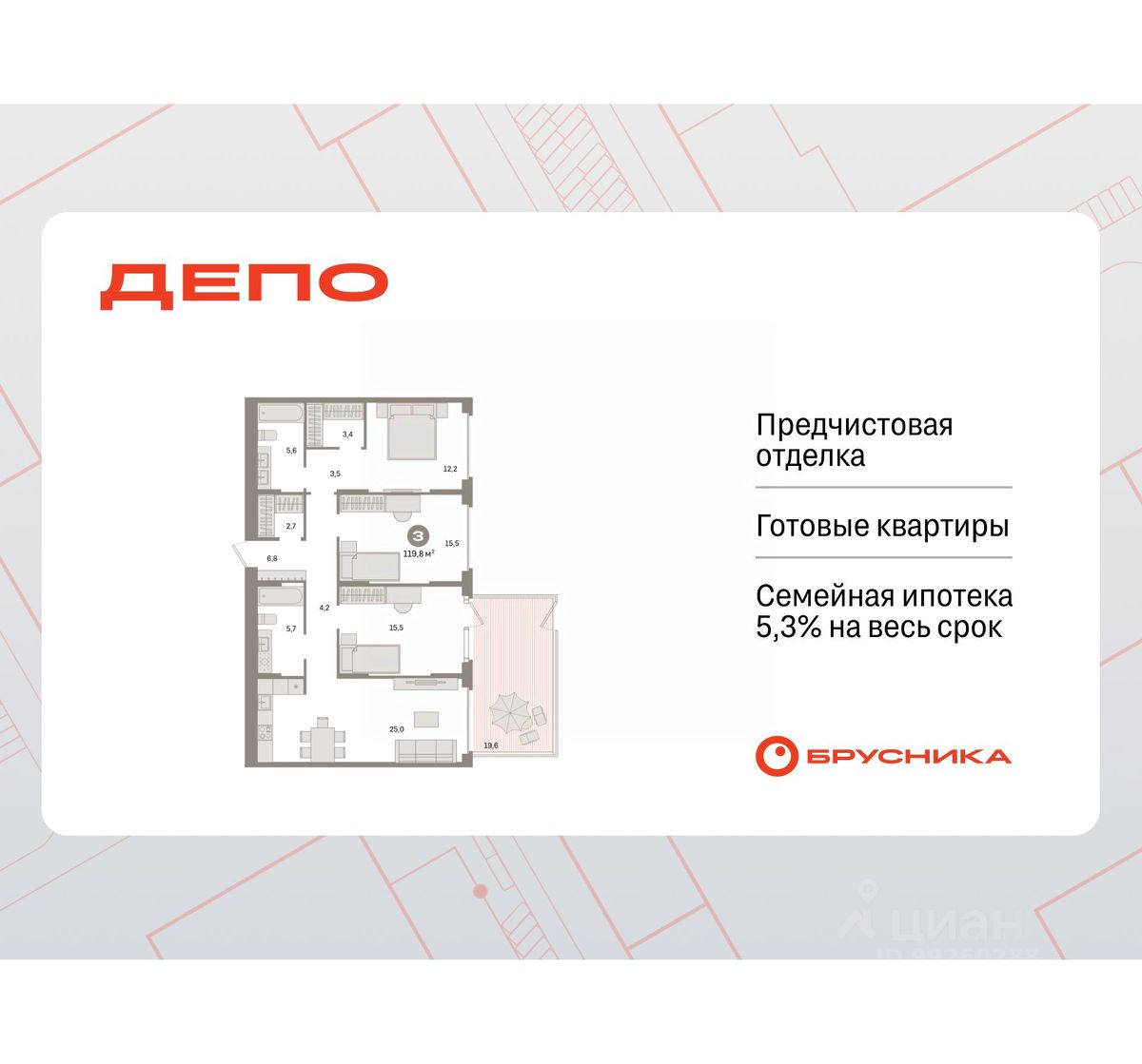 Квартира с кухней-гостиной и тремя спальнями в квартале "Депо". Особенности планировки: второй санузел, гардеробная, окна в пол, вид во двор, панорамное остекление, предчистовая отделка, мастер-спальня, терраса.