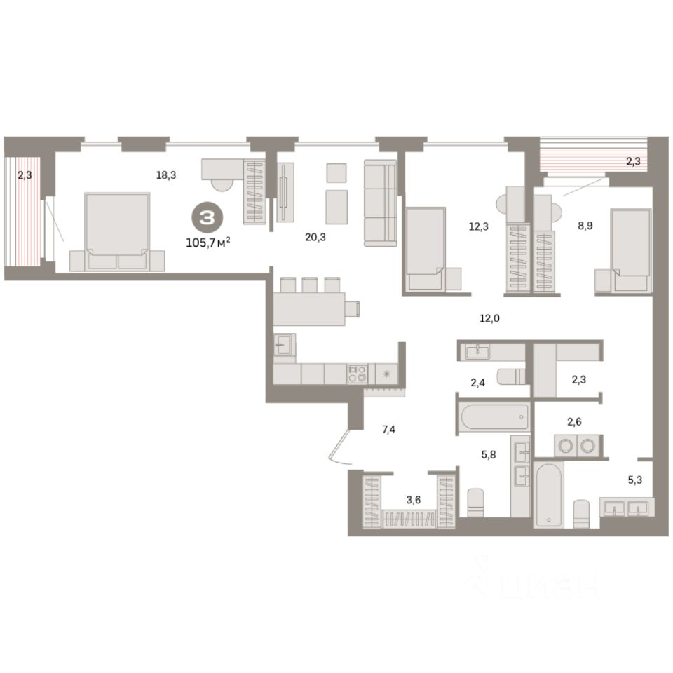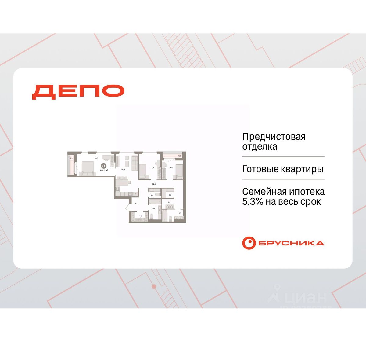 Квартира с кухней-гостиной и тремя спальнями в квартале "Депо". Особенности планировки: второй санузел, гардеробная, лоджия, разнесённые спальни, предчистовая отделка, постирочная.