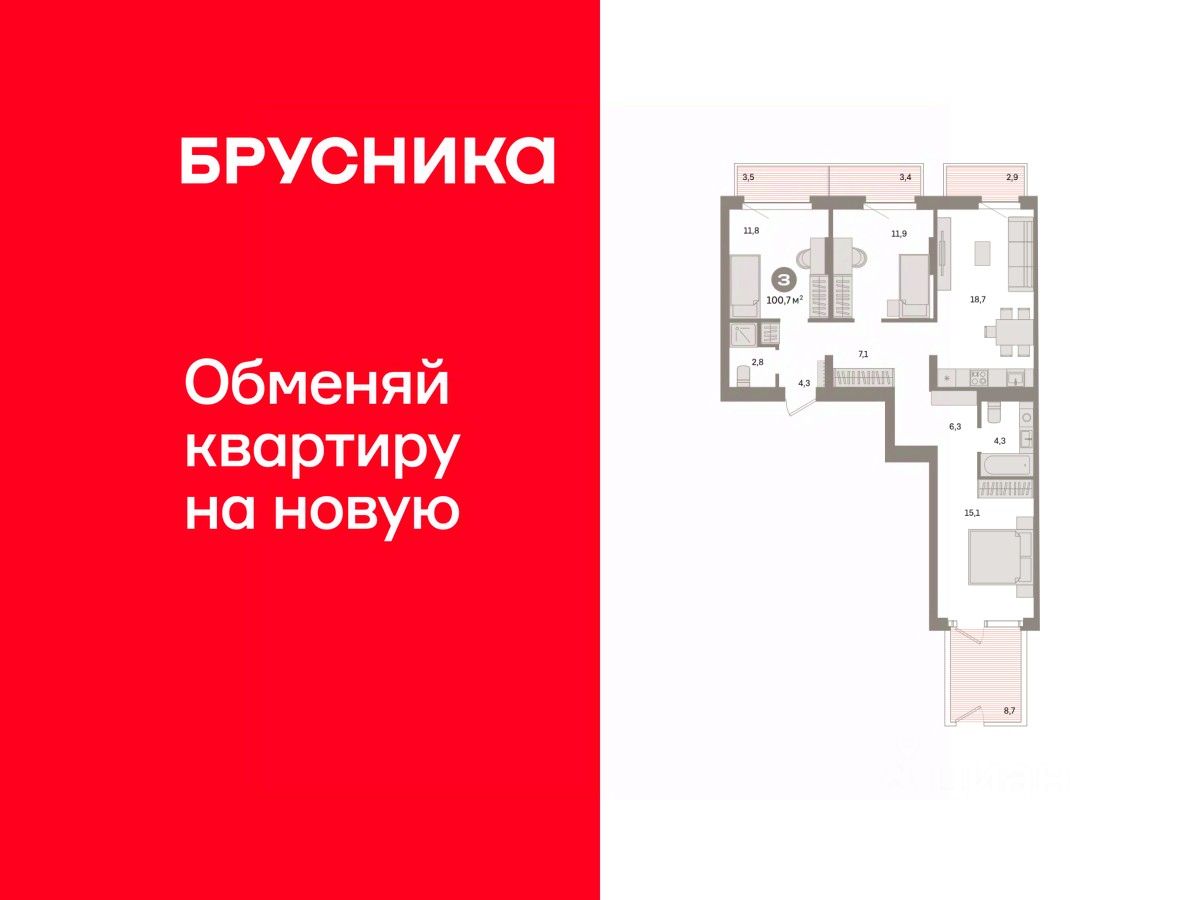 Квартира с кухней-гостиной и тремя спальнями в квартале "Депо". Особенности планировки: балкон, окна на две стороны, предчистовая отделка, разнесённые спальни.