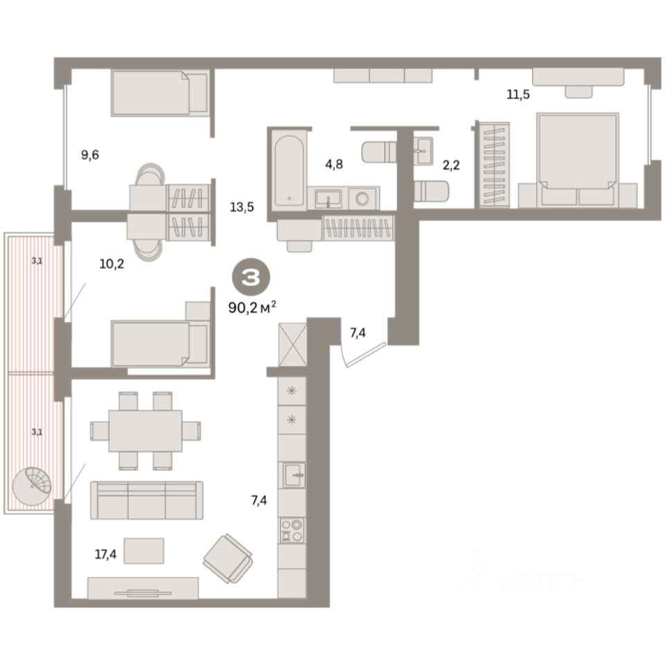 Квартира с кухней-гостиной и тремя спальнями в квартале "Депо". Особенности планировки: окна на две стороны, второй санузел, вид во двор, разнесённые спальни, предчистовая отделка, балкон.
