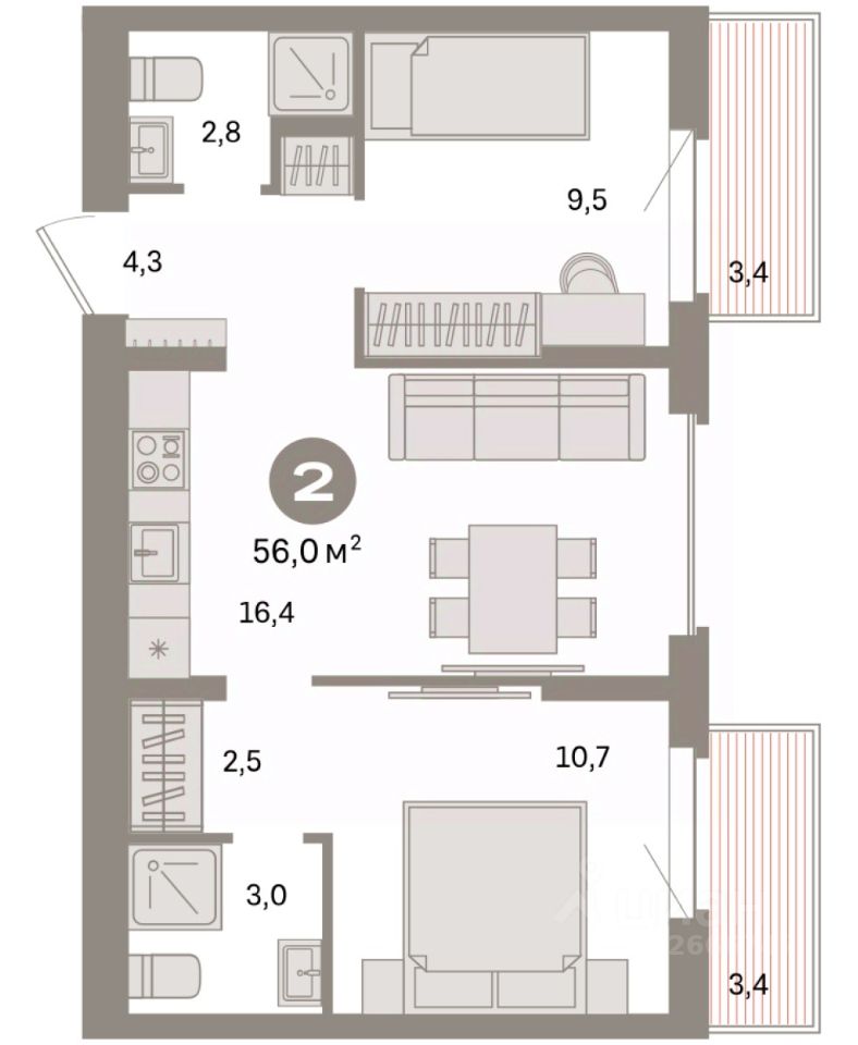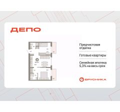 Квартира с кухней-гостиной и двумя спальнями в квартале "Депо". Особенности планировки: второй санузел, гардеробная, вид во двор, разнесённые спальни, предчистовая отделка, мастер-спальня, балкон.