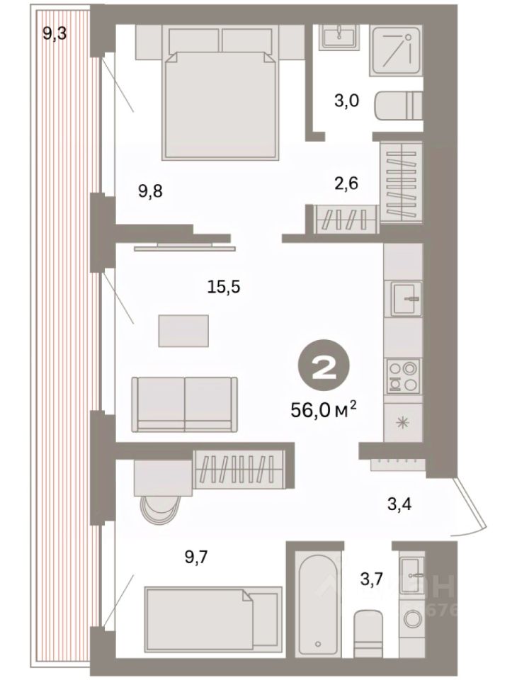 Квартира с кухней-гостиной и двумя спальнями в квартале "Депо". Особенности планировки: второй санузел, гардеробная, разнесённые спальни, предчистовая отделка, мастер-спальня, терраса на крыше.