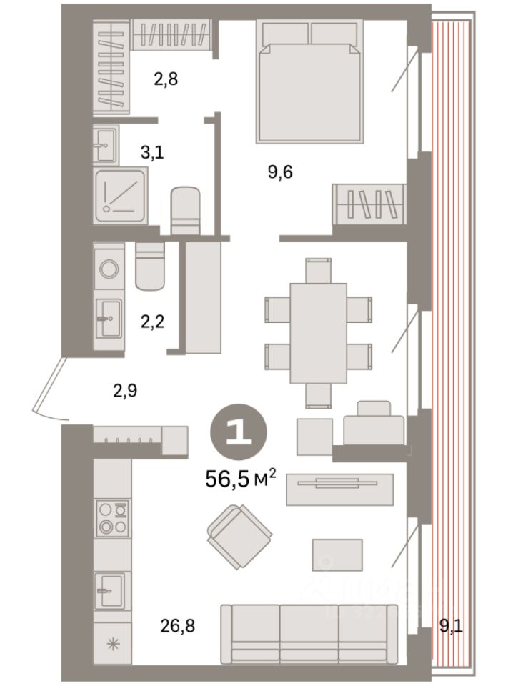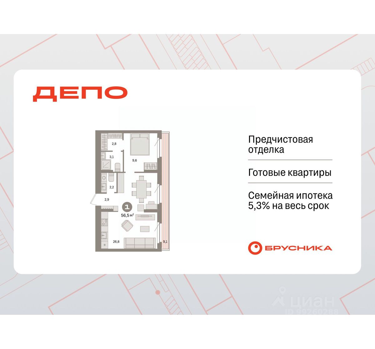 Квартира с кухней-гостиной и одной спальней в квартале "Депо". Особенности планировки: второй санузел, гардеробная, предчистовая отделка, мастер-спальня, терраса на крыше.