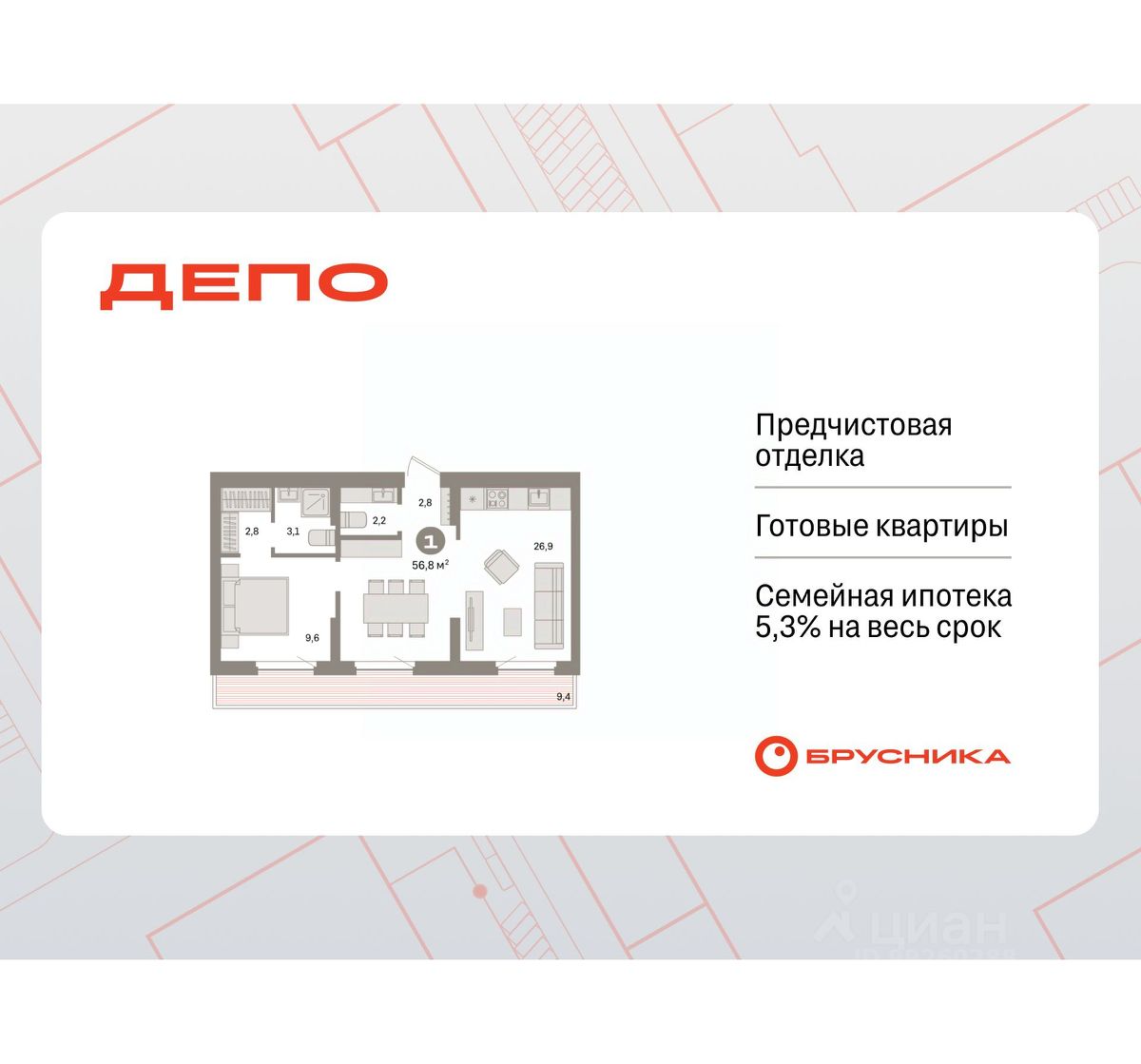 Квартира с кухней-гостиной и одной спальней в квартале "Депо". Особенности планировки: второй санузел, гардеробная, предчистовая отделка, мастер-спальня, терраса на крыше.