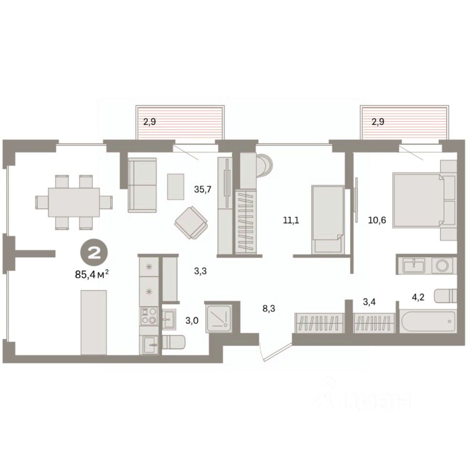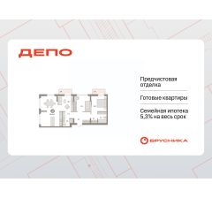Квартира с кухней-гостиной и двумя спальнями в квартале "Депо". Особенности планировки: второй санузел, гардеробная, рабочий кабинет, предчистовая отделка, мастер-спальня, балкон.