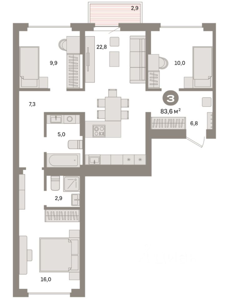 Квартира с кухней-гостиной и тремя спальнями в квартале "Депо". Особенности планировки: второй санузел, вид во двор, разнесённые спальни, предчистовая отделка, мастер-спальня, балкон.