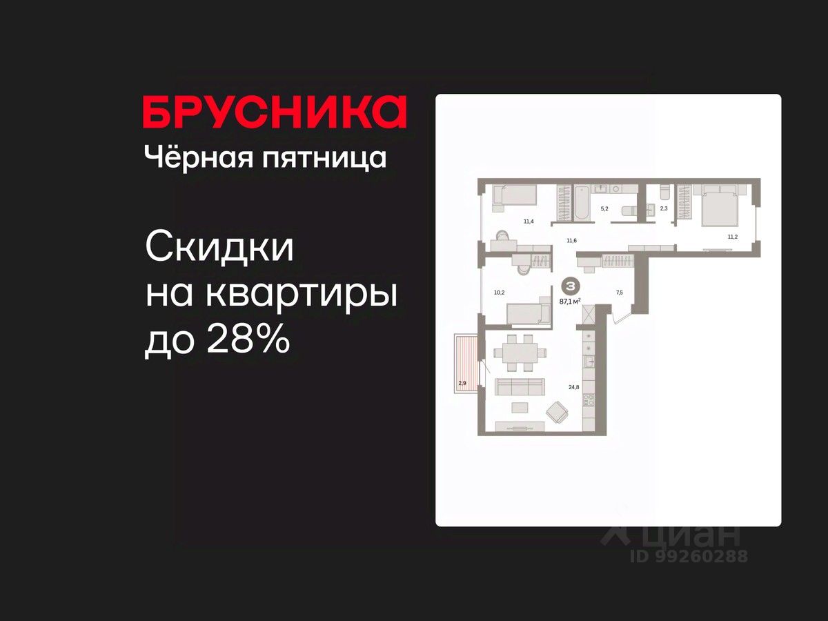 Квартира с кухней-гостиной и тремя спальнями в квартале "Депо". Особенности планировки: окна на две стороны, второй санузел, вид во двор, разнесённые спальни, предчистовая отделка, балкон.