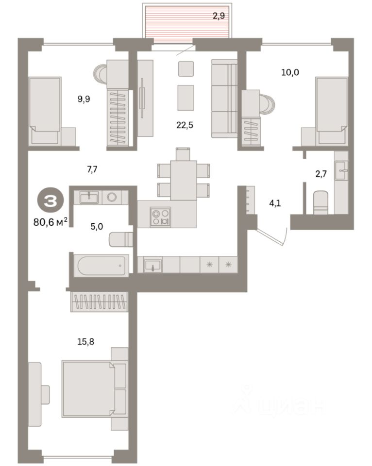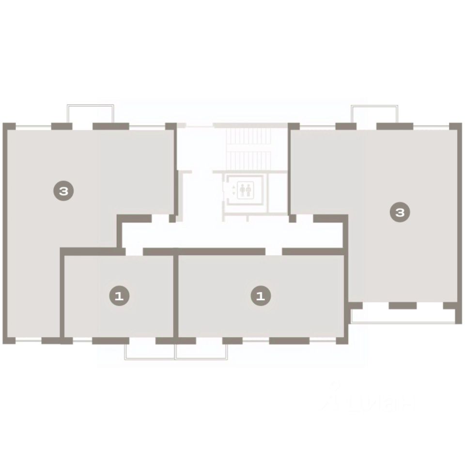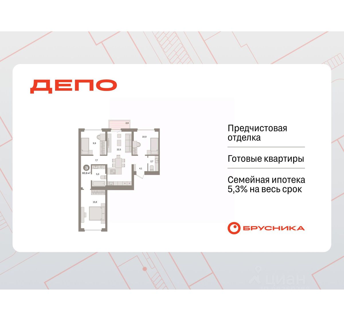 Квартира с кухней-гостиной и тремя спальнями в квартале "Депо". Особенности планировки: второй санузел, разнесённые спальни, предчистовая отделка, балкон.
