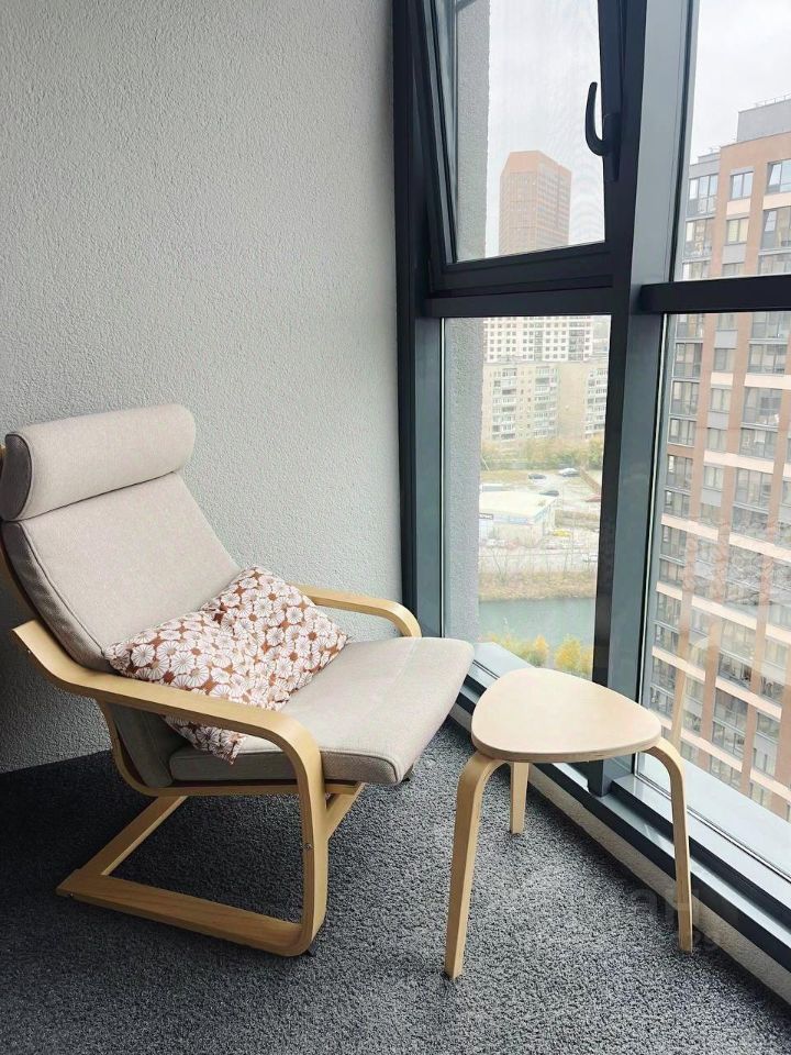 Лоджия оборудована для отдыха: мягкий ворс на полу и кресло IKEA — идеальное место, чтобы наслаждаться видом города