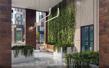 Интерьер вестибюля с кофейней, камином и панорамными видами выполнен в благородных приглушенных тонах с авторским панно из мозаики. Это уютное и полезное пространство, чтобы назначить встречу, поработать или дождаться такси. А в любимой кофейне жители всегда могут насладиться чашечкой свежесваренного кофе с горячим круассаном или купить свежий хлеб.