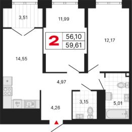 Продаётся квартира в ЖК "Тёплые кварталы". 2-комнатная квартира, 59,61 м², 518, Очередь 3, дом 2. Стоимость указана с учетом чистовой отделки.
