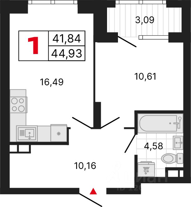 Продаётся квартира в Квартал-парк "Каменные палатки". 1-комнатная квартира, 44,99 м², 43, Очередь 4, секция 16. Стоимость указана с учетом чистовой отделки.