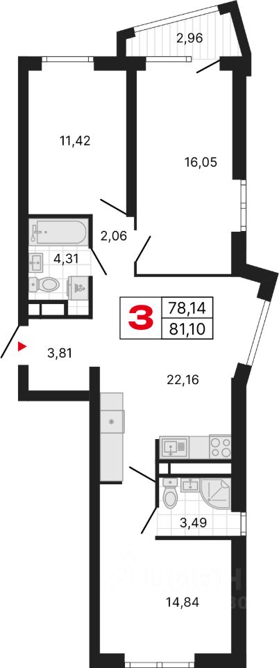 Продаётся квартира в Квартал-парк "Каменные палатки". 3-комнатная квартира, 80,41 м², 269, Очередь 4, секция 16. Стоимость указана с учетом чистовой отделки.
