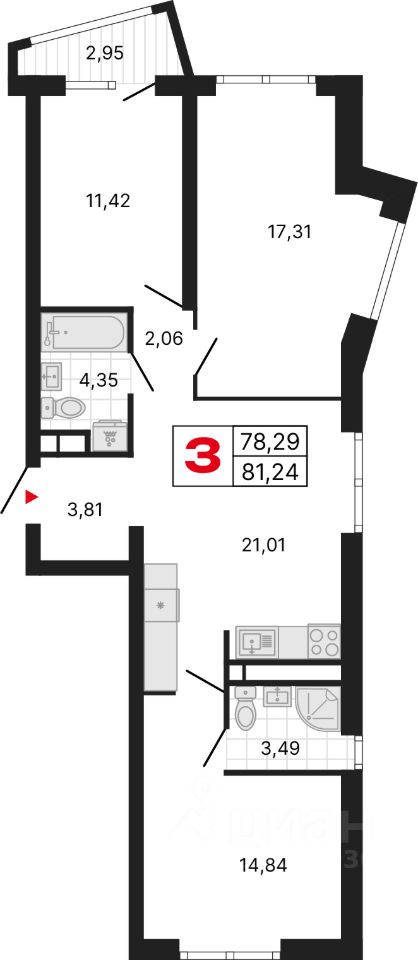 Продаётся квартира в Квартал-парк "Каменные палатки". 3-комнатная квартира, 80,51 м², 325, Очередь 4, секция 16. Стоимость указана с учетом чистовой отделки.