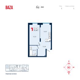 Продаётся квартира в Квартал-парк "Каменные палатки". 1-комнатная квартира, 51,54 м², 1, Очередь 4, секция 16. Стоимость указана с учетом чистовой отделки.