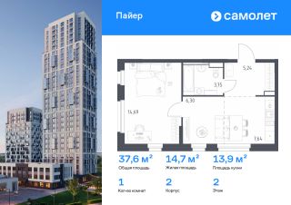 Строим кварталы для жизни с заботой о будущем. Предлагается 1-комнатная квартира комфорт-класса 37,62 кв.м в корпусе 2 на 2 этаже, в ЖК "Пайер"