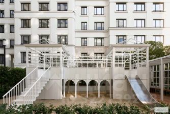 Вход во двор организован через колоннаду. Планировочно он разделён на две части. Парадный партер с большим количеством стриженых растений, фонтанами, цветущими кустарниками и более "домашняя", уютная зона, где высажены деревья и низкорослые хвойные растения, многолетники. В центре двора — две детские площадки. #zso077