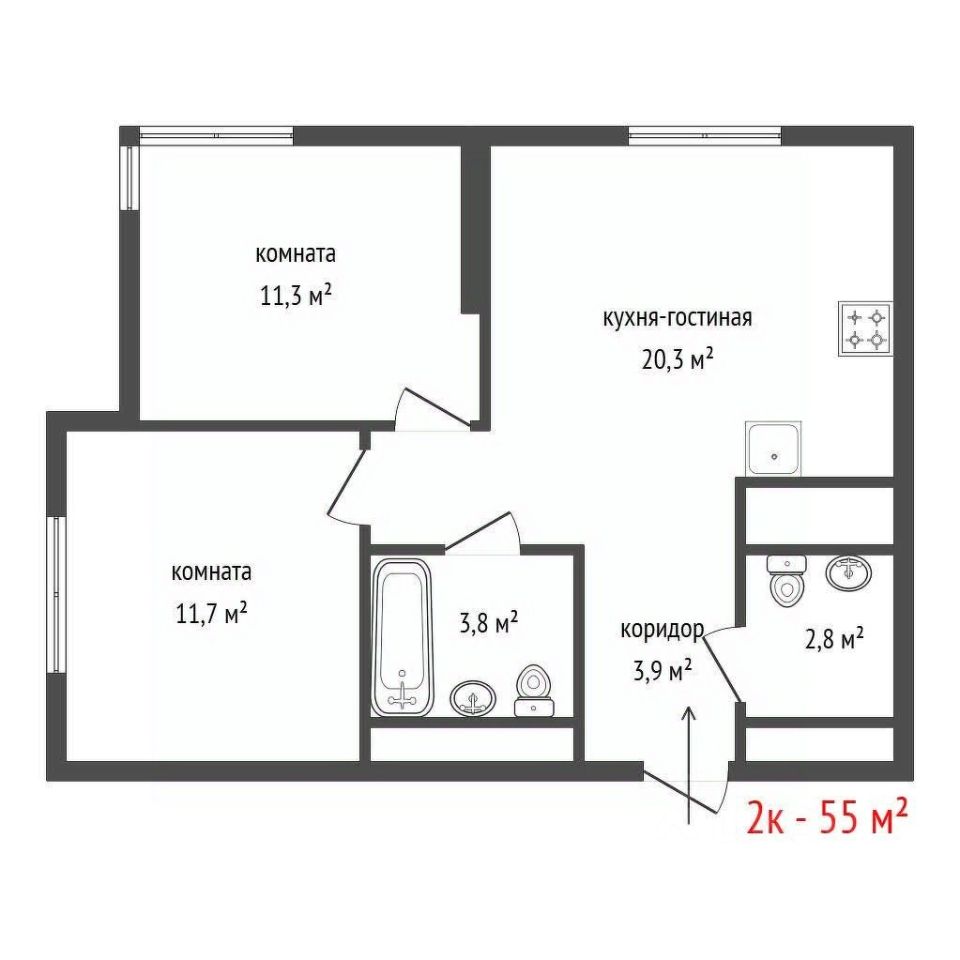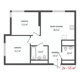 - большая кухня-гостиная 20м2 + 2 спальни правильной формы