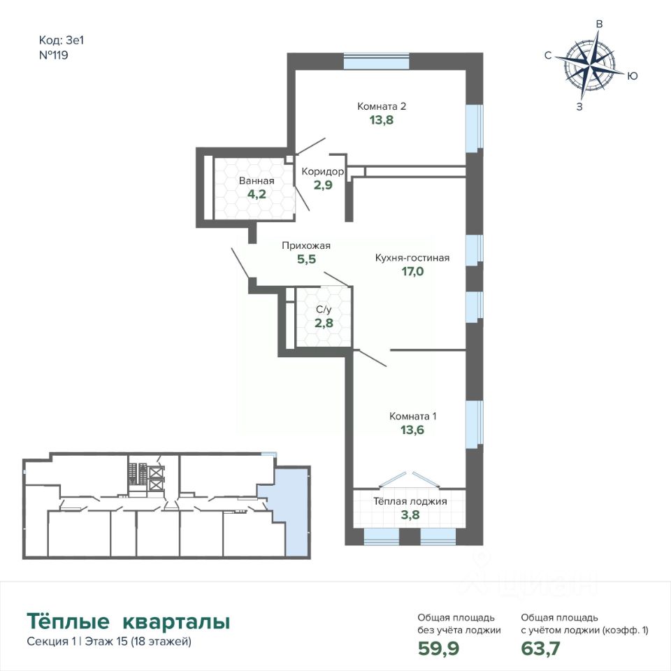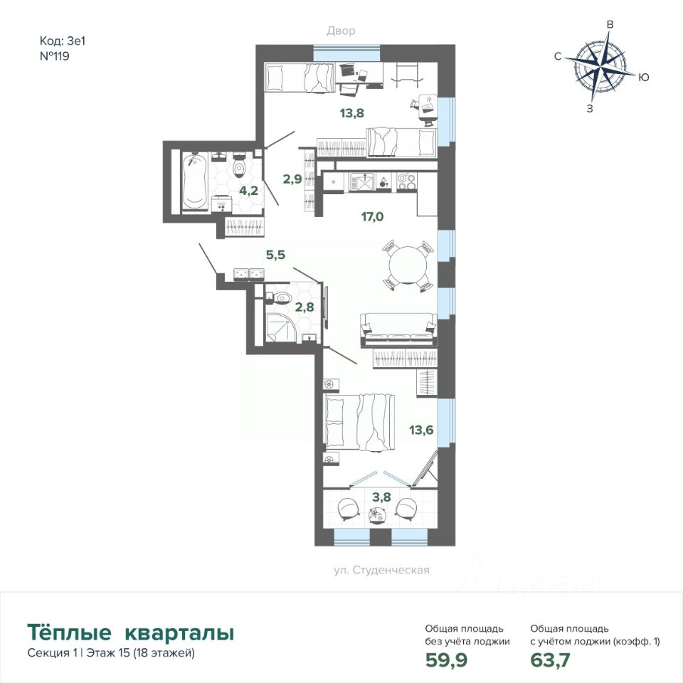 Продаётся 2-комнатная квартира в строящемся доме (3 очередь, корпус 1), срок сдачи: II-кв. 2025, общей площадью 63.71 кв.м., на 15 этаже. Семейный жилой квартал повышенной комфортности в квартале улиц Блюхера - Студенческая.Доступный комфорт для семей с детьми и тех, кто только планирует.