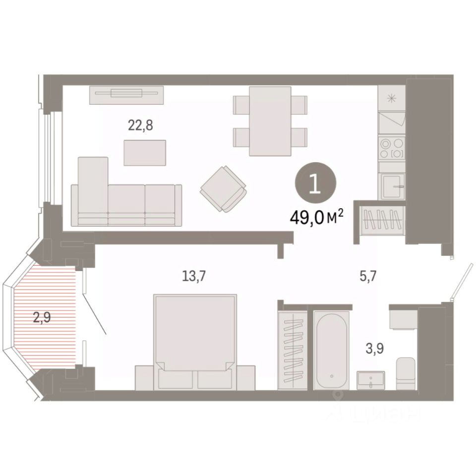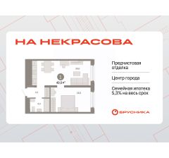 Квартира с кухней-гостиной и одной спальней в квартале "На Некрасова". Особенности планировки: предчистовая отделка.