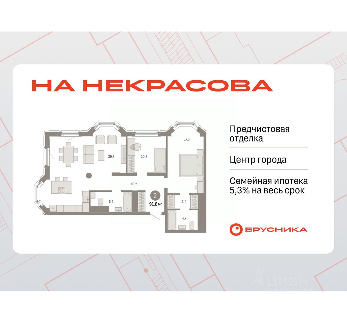 Квартира с кухней-гостиной и двумя спальнями в квартале "На Некрасова". Особенности планировки: второй санузел, предчистовая отделка, мастер-спальня.