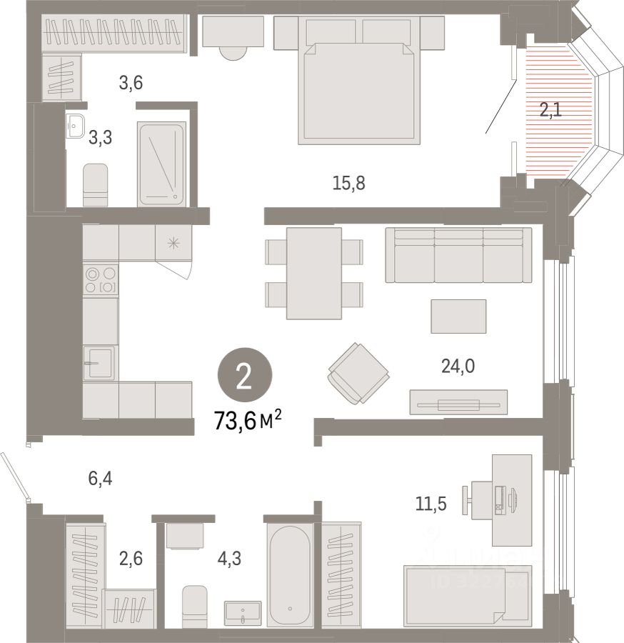 Квартира с кухней-гостиной и двумя спальнями в квартале "На Некрасова". Особенности планировки: второй санузел, вид во двор, лоджия, предчистовая отделка, мастер-спальня.